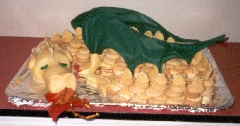 ![]() | The Jumbals and Fine Cakes were presented as a sotletie, in the shape of a dragon, with marzipan head and feet, and paper wings - see here for details of his construction. He was made by Lady Cassandra Tantifer. |