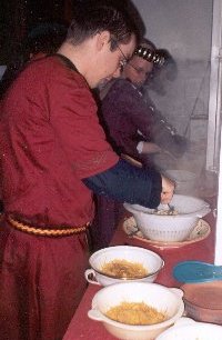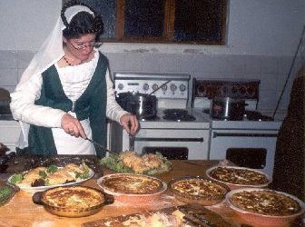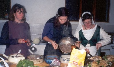 Dragonfire is the annual tournament of CLAWs, the University of Cape Town's role-playing society. On several occasions the Shire has co-operated with CLAWs in running a medieval feast as the opening salvo in the weekend. This is rather fun for us, in that it gives us a much bigger feast than we're used to (I think this one was about 50); our Shire is rife with role-players anyway, and even those feast attendees who are not into the SCA are quite okay with medieval costume. It's usually a very good party, and is spreading far and wide the local SCA's reputation for Good Food, TM.