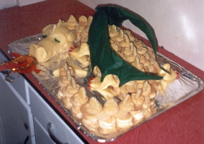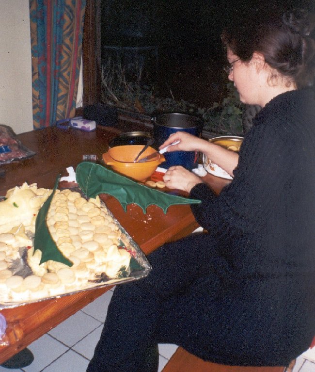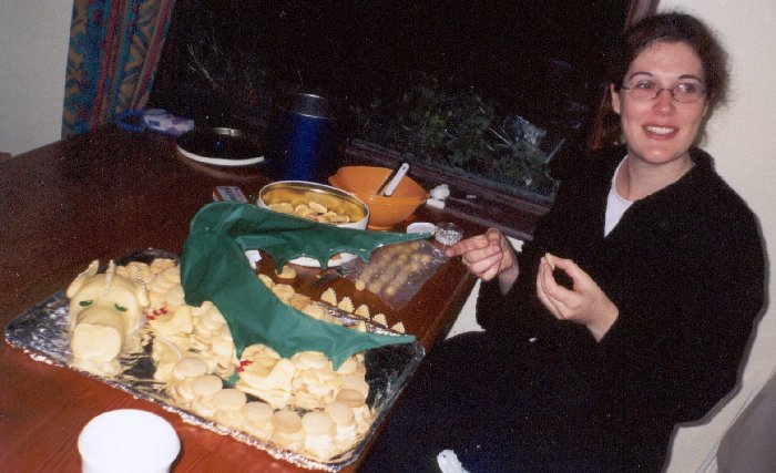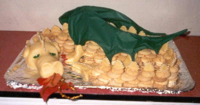 Our Shire's annual Dragonfire feast is held jointly with the local campus role-playing society's annual tourney; in 2002 I was Head Cook (see full menu here). Since it's called Dragonfire, I wanted to provide some sort of edible dragon subtlety for the feast. I had a couple of hazy ideas for a biscuit-dragon and a bread-giraffe; these were translated into amazing reality by the subtlety cook, Lady Cassandra Tantifer (Claire Blackman). I shall attempt to semi-document the process, below. Oswald the DragonOswald was a biscuit-dragon: that is, his body was made up of piles of small, round biscuits, cemented together with icing to vaguely suggest scales. The dessert was a sideboard largely intended to be eaten in the fingers in between dancing, so biscuits made sense. The recipes I used were Elizabethan, John Partridge's Fine Cakes, and Gervase Markham's Jumbals (recipes here). Both recipes result in a dough which can be rolled out and cut into the relevant shapes (I use a sherry glass as a cutter), or else rolled into balls and stamped with a design to squash them into shape. The icing was simply sugar and rosewater, as suggested in Digby's Excellent Small Cakes recipe. It isn't madly sticky, but had enough adhesive properties to keep the biscuits from sliding off the tray when we transported the dragon. |