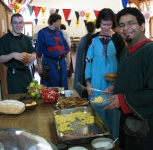 Here Be Dragons Genadendal, 1-2 November 2003 Head Cook: Lady Jehanne de Huguenin This was our first ever event that ran for more than one day, and entailed travelling out of Cape Town, and away from the familiar confines of my kitchen, known event sites, handy shops and the like. It was also the first time I had cooked for an entire weekend, rather than simply a feast with possibly a lunch snack table. Challenging all round, and, in the event, enormous fun. I envy those SCA types who regularly cook for longer events – the untold luxury of being able to recover after the feast by becoming happily tipsy, bed within staggering range, and not having to pack the damned car, cannot be overstated. On the other hand, I forgot to pack the cream when transferring food from my fridge into the coolers for the trip. We had to buy out all the cream in the little shop in the town when I realised what had happened. I also had to make about three crème caramels in a row when I got back. (Darn). Genadendal is a tiny little town in the mountains about one and half hour’s travel from Cape Town, the site of the oldest mission in South Africa (only 18th century, but hey). The lovely old buildings included a large, attractive hall with a big kitchen, useful quantities of cooking utensils (including big pots), and a terrifying bank of enormous commercial stoves, which turned out to have a bizarre and dodgy relationship between the oven and the plate on top. Using the top plates, it transpired, caused superheating in the oven below (scorched fruit tarts). Not using the top plates caused a ve –e –e-ry slo –o –ow oven beneath (late second course). Next time I shall bring a couple of electric hobs. Things the kitchen did not include included an egg whisk. We whipped the cream by passing it around the Shire in a plastic bottle containing two teaspoons, and demanding that everyone shake it. The upshot was something a bit like a conga line. In honour of the Bavarian founders of the Genadendal Moravian mission, I chose to cook from German sources, including one 14th-century source and two 16th-century. This is a lovely cuisine, one of my favourites, with a good selection of recipes. I had to provide lunches on Saturday and Sunday, breakfast on Sunday, and the feast on Saturday night. Lady Ginevra kindly volunteered to do the initial lunch, which took some of the pressure off, but the rest I cooked myself. There were only 20 of us, so it wasn’t particularly demanding. Breakfast in medieval times was very different to our current assumptions, so I fear I departed from strict medieval accuracy in order to give early-morning people more familiar food. I’m not sure how the Shire would take to bread, fish and ale first thing in the morning… There is a scrambled-egg-like dish in the English 14th century corpus, so it’s not too much of a stretch. Tea and coffee are not in any way period at all, but I’m not dealing with the Shire on no caffeine. More importantly, the Shire doesn’t want to deal with me on no caffeine… Please note that I’m terrible at measuring when I cook, so quantities given below are somewhat impressionistic. Bibliography Das Buch von Guter Spise (14th century), tr. Alia Atlas.