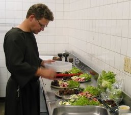 Mogr laying out starter platters in the kitchen. | The first course was platters with a whole assortment of finger-foods, nicely arranged with red and green lettuce. I probably overestimated quantities (as usual), since the Shire polished off the platters in short order, but had not quite enough room left for the main course. |