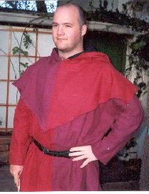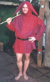 (7) Another initial letter Fool from a 14th century psalter, and (8) view of my construction showing hood worn open. FABRIC: the outfit is made entirely from linen, with the exception of the hood, which is a light wool. These are both authentic fabrics for this period, although I was unable to find a plain linen without the distinctive modern slub effect; medieval linens would have been evenly woven. The bells are plain metal and of a simple construction which doesn’t look too different to what I can see from the pictures. BIBLIOGRAPHYMary G. Houston, Medieval Costume in England and France, 1939, London: Adam and Charles Black. Stella Mary Newton, Fashion in the Age of the Black Prince, 1980, Woodbridge: Boydell My thanks to Samson Mottley (Dylan Craig) for suggesting the project, consenting to model it for the A&S, and submitting to have pins stuck into him while I fitted the darned thing