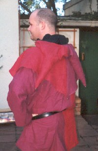 (5) Houston’s construction, and 6) My adaptation In addition, given that we are in Africa and heat is often a problem, I deliberately cut the hood so that the wearer can push it back over his shoulders, in the manner seen in dress of another Psalter fool, (7) below. This entailed leaving an opening at the throat, which is closed with a button and loop so that the hood sits closely around the face when worn. Because of this requirement, I also lined the hood in black, which contrasts well and looks good when worn open. Newton suggests that some fourteenth-century hoods may have had a fur lining (1980: 56), but that seems a bit excessive for this climate!