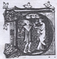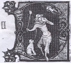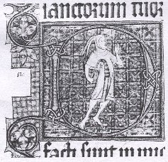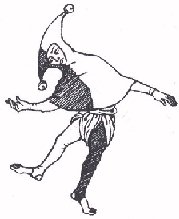 Figures (1)& (2): Illuminated initial Ds from 14th century Psalters, Psalm 53 According to Newton, the fool occupied a position of some importance in the royal courts of the fourteenth century; she gives several instances of the privileges and respect accorded the fool (Newton, 1980: 80), including elaborate headdresses and clothing. She also notes wardrobe accounts which record fools as receiving hoods as part of their allowance (1980: 81). As seen in the two Psalter examples (1 & 2) above, there is considerable variation in the dress of the fool; recurring themes include some kind of bauble or bladder, bare feet, and a hood, but these are by no means present in all depictions of fools. The tunic generally seems to be quite short; other examples show only a breech-clout worn with the hood (see Fig 7 below). In the two examples (Figs 1 & 2) above, the hoods variously have three or two points. According to Newton, the fool’s hood was referred to as an aumuces in many accounts, a term which implies two points (Newton: 1980: 84). Although fourteenth century art is quite stylised, it seems likely that one of the hoods has points which are designed to stick straight up into the air (1), while the other allows them to droop (2). (1) has bells at the hood points and at the tips of the square-cut cape. The particolour example below also has bells. STYLEThe outfit I have chosen to construct is based on the standard fourteenth-century men’s tunic and cape/hood combination, as seen below. The cape sits around the shoulders, presumably offering added warmth, with the hood attached. The long tail of the hood, seen below, develops easily into the stuffed and exaggerated multiple points of the jester's hood.