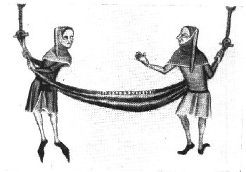 (3) Men from the Luttrell Psalter, mid 14th-century. As well as the cape and hood, the fourteenth century is also characterised by the use of particolour tunics; Houston reports this as "a favourite effect" of the century, giving examples in various British Museum manuscripts of the early and mid 14th century (1939: 95, 109). Among the colour combinations she reports are blue and fawn, red and white, blue and white. (The particularly loud combination of red and pink in my construction of a jester’s costume was a choice of its wearer). In addition, Houston reports at least one example of a jester’s costume with a particolour hood: see Fig 4, below.