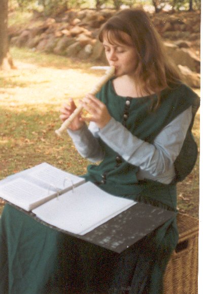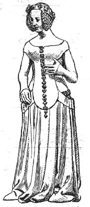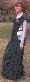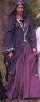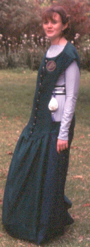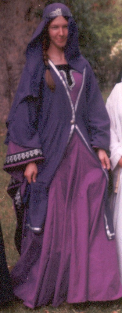 My first outfit, worn by my friend Kathy (Kate of the Oaks), who inherited it when I grew out of it. Norman a la Norris (drawing is from Norris p. 42), Oriental surcoat and all. Norris is a very dodgy source, I'm not sure where he got the surcoat thingy from. The construction of the dress is all wrong, it's a mundane fitted princess-line pattern, but the sleeves are all right. Kathy should notbe wearing a purple veil, it should be white, I know that now!